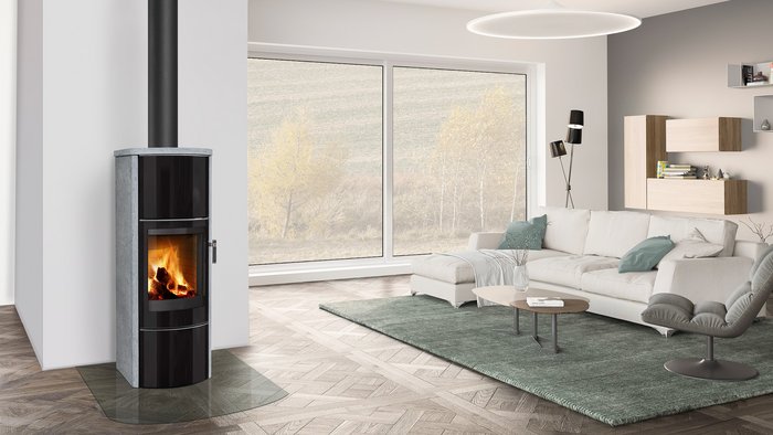 Mit seiner ovalen Form und seiner gebogenen breitgezogenen Scheibe sticht der Kaminofen Vulenta ins Auge. Auf dem Bild ist er als Speicherofen zu sehen. Es gibt ihn auch klassisch und auf einem Fuß.